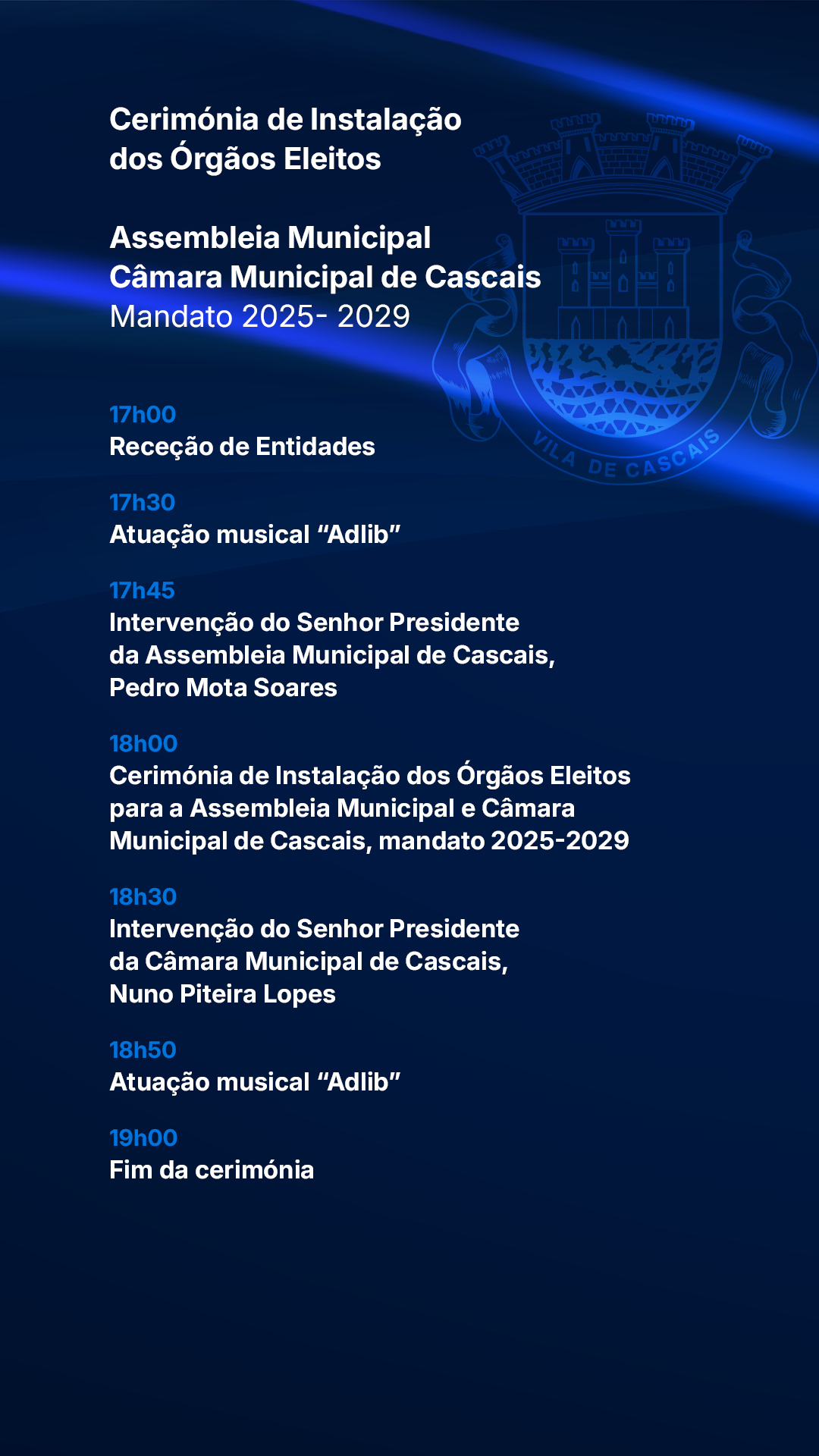 A Cerimónia de Instalação dos Órgãos Municipais 2025–2029 representa, assim, um momento de continuidade e renovação democrática, reafirmando o compromisso dos novos eleitos com o futuro de Cascais e com o serviço público em prol da comunidade.